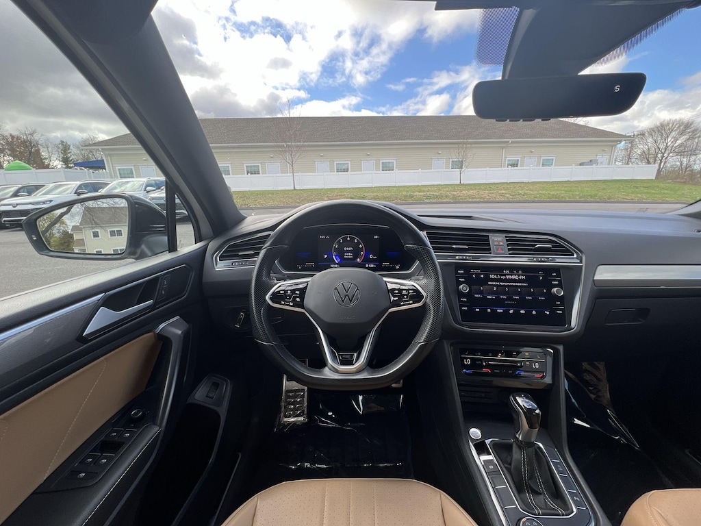 Don't miss this exceptional opportunity to own a CERTIFIED ONE OWNER 2022 Volkswagen Tiguan SE R-Line Black with 4MOTION all-wheel drive! This striking Pure White exterior paired with luxurious Cinnamon Perforated V-Tex Leatherette Seating creates a sophisticated aesthetic that's turning heads at Gene Langan Volkswagen Inc.